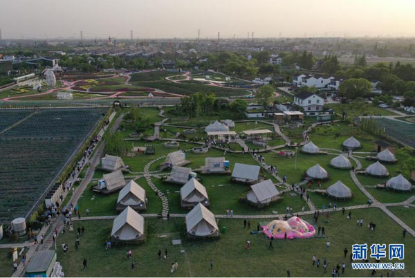 4月29日拍攝的第四屆石淙花海龍蝦節(jié)活動現(xiàn)場(無人機照片)。
