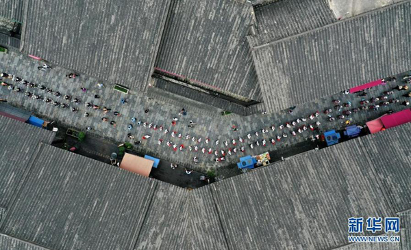 5月16日,身著盛裝的苗族群眾在丹寨萬(wàn)達(dá)小鎮(zhèn)參加服飾展示活動(dòng)(無(wú)人機(jī)照片)。