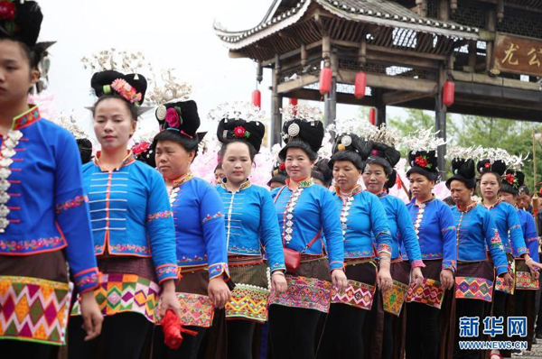 5月16日,身著盛裝的苗族群眾在丹寨萬(wàn)達(dá)小鎮(zhèn)參加服飾展示活動(dòng)。