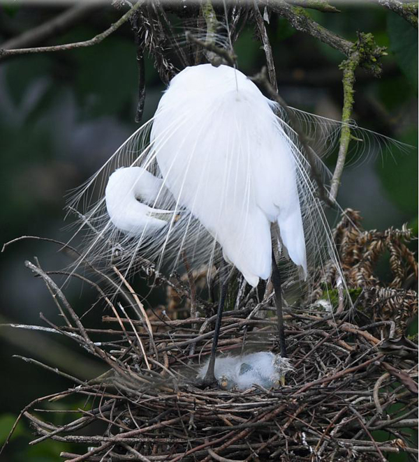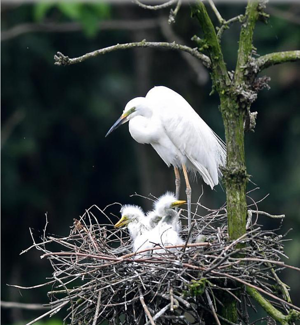 在南昌市新建區(qū)象山森林公園內(nèi),白鷺守護著雛鳥(5月18日攝)。