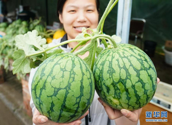 5月23日,在南京市江寧區(qū)橫溪街道,瓜農在展示西瓜。