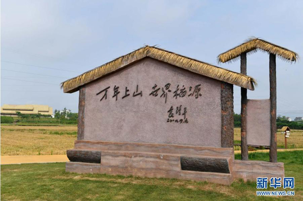 在上山考古遺址公園拍攝的袁隆平院士題詞——“萬年上山 世界稻源”(5月12日攝)。
