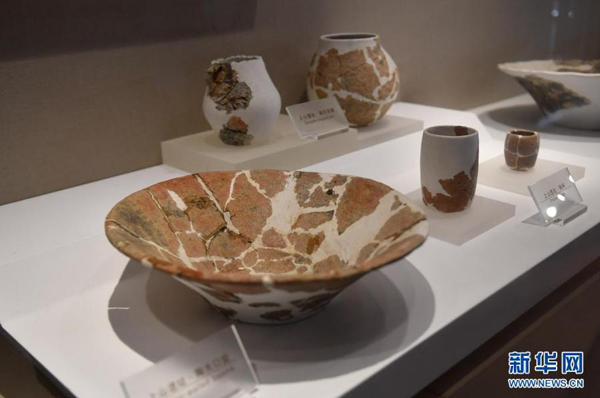 上山考古遺址公園遺址館展出的陶大口盆(5月12日攝)。