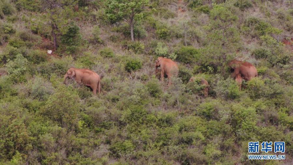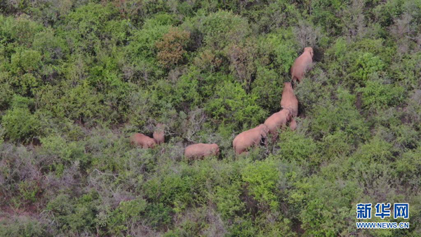 6月22日在云南省玉溪市峨山縣大龍?zhí)多l(xiāng)附近拍攝的象群(無人機視頻截圖)。
