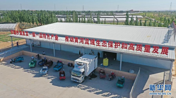 在寧夏石嘴山市平羅縣陶樂鎮(zhèn)沙漠瓜菜園區(qū)冷鏈庫,冷鏈車準(zhǔn)備運(yùn)輸沙漠瓜菜(無人機(jī)照片,7月7日攝)。