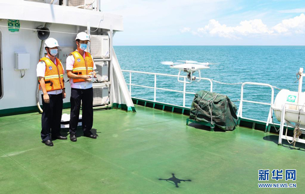8月16日,海南海事部門工作人員在“海巡1102”輪上使用無(wú)人機(jī)查看瓊州海峽通航情況。據(jù)了解,為保障數(shù)萬(wàn)艘漁船集中通過(guò)瓊州海峽出海作業(yè),海南海事、農(nóng)業(yè)、綜合執(zhí)法等部門聯(lián)合開(kāi)展巡航執(zhí)法行動(dòng),共同護(hù)航開(kāi)漁安全。