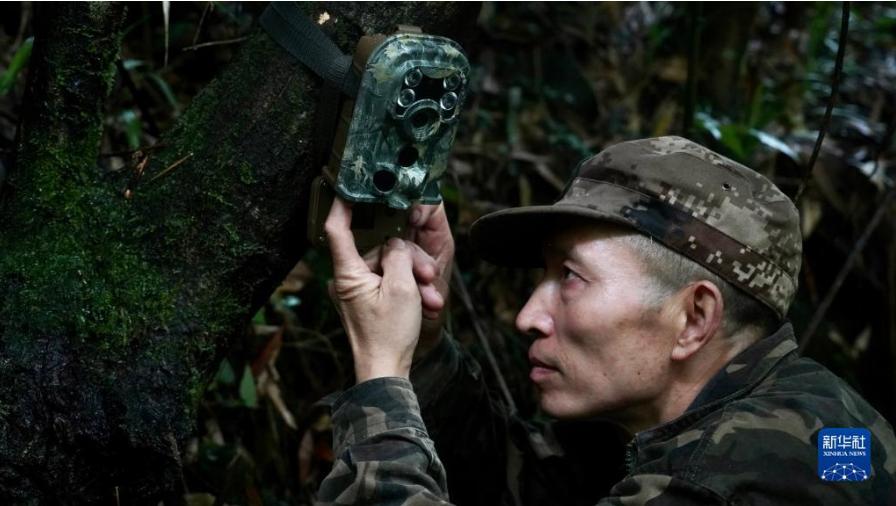 8月25日,在大熊貓國家公園四川片區(qū)大邑區(qū)域,大蒜坪管護(hù)站巡護(hù)隊(duì)長張學(xué)良在安裝紅外相機(jī)。新華社發(fā)(陳居偉 攝)
