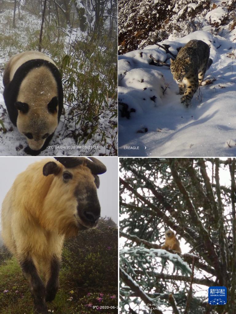 這張拼版照片顯示的是大熊貓國家公園大邑管護(hù)總站近年來拍攝到的部分野生動(dòng)物,左上為大熊貓,右上為雪豹,左下為羚牛,右下為金絲猴(資料照片)。新華社發(fā)