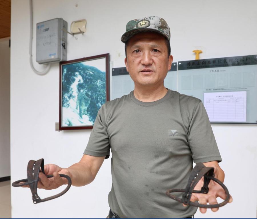 8月25日,在大熊貓國家公園四川片區(qū)大邑區(qū)域,大蒜坪管護(hù)站負(fù)責(zé)人龐明建向記者展示巡護(hù)查獲的捕獵器具。新華社記者 高搏揚(yáng) 攝