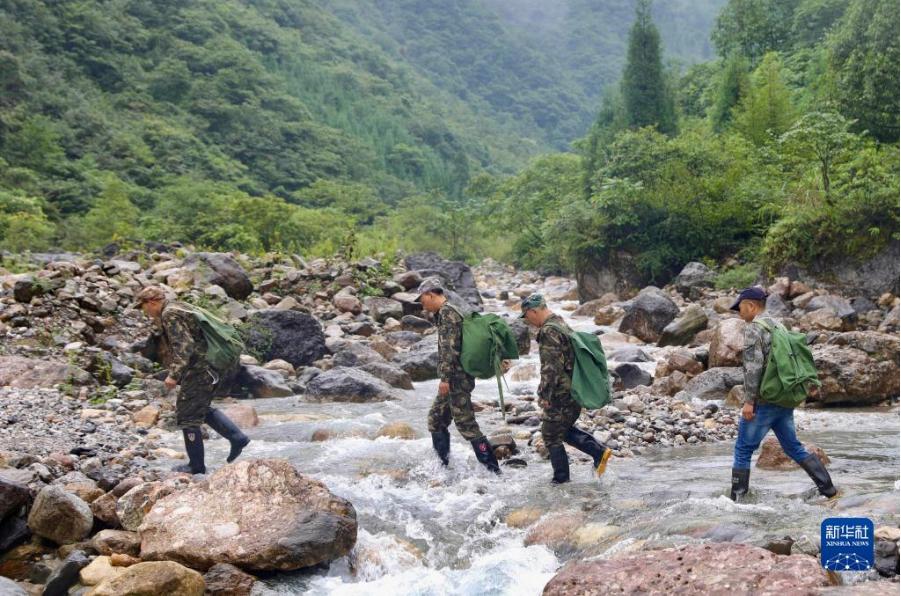 8月25日,在大熊貓國家公園四川片區(qū)大邑區(qū)域,大蒜坪管護(hù)站的巡護(hù)隊(duì)員在渡河。新華社記者 高搏揚(yáng) 攝