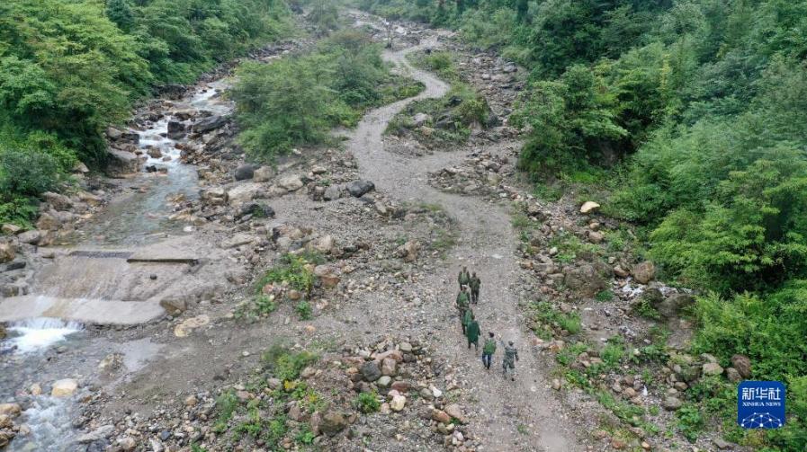 大熊貓國家公園大邑管護(hù)總站大蒜坪管護(hù)站巡護(hù)隊(duì)員在巡護(hù)(8月25日攝,無人機(jī)照片)。新華社記者 蕭永航 攝