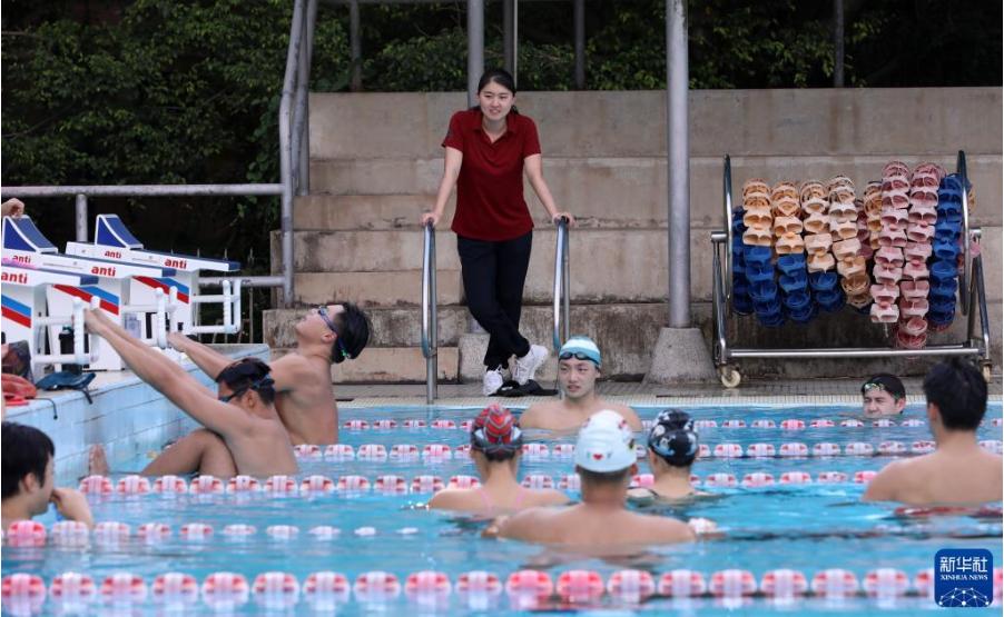 9月7日,奧運冠軍焦劉洋為學生們上游泳課。新華社記者 黃國保 攝