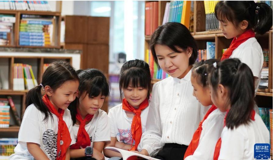 9月7日,沈陽市渾南區(qū)第九小學教師陳秋穎陪伴學生閱讀。新華社發(fā)