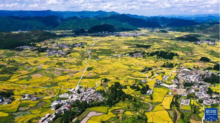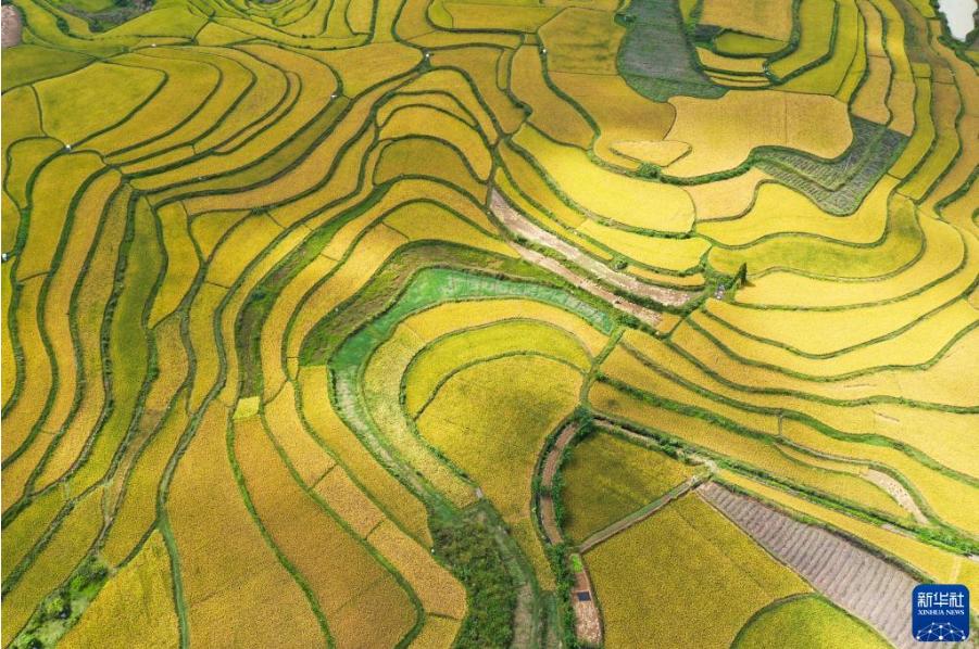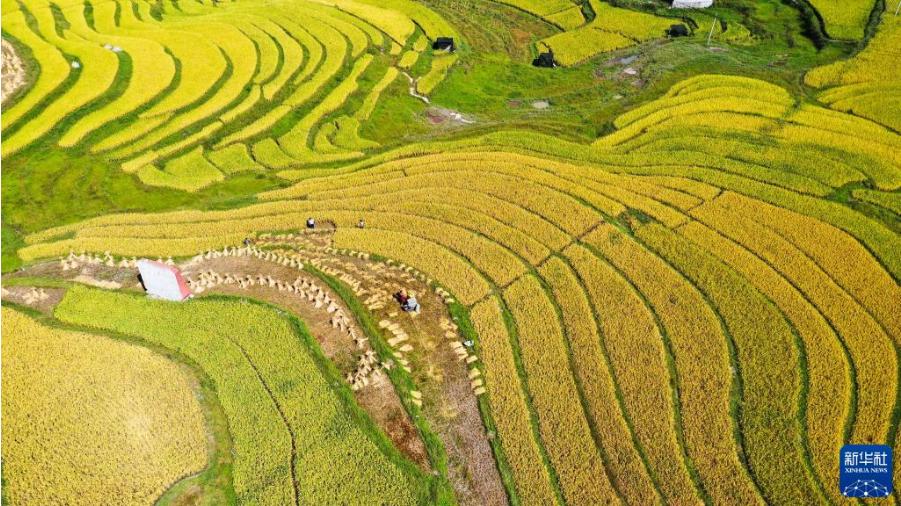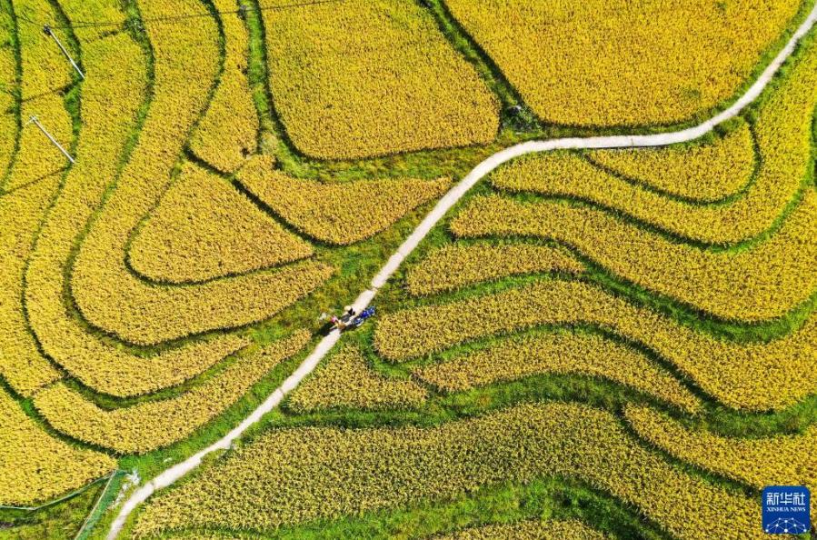 連日來,貴州省黔南布依族苗族自治州龍里縣灣灘河鎮(zhèn)天氣晴好。水稻成熟,田野鍍金,農(nóng)民搶收稻谷,一片豐收景象。
