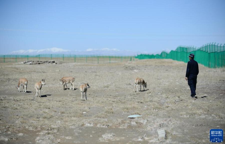 在可可西里國家級自然保護(hù)區(qū)索南達(dá)杰保護(hù)站,幾只藏羚羊在野生動物救助中心活動(9月28日攝)。