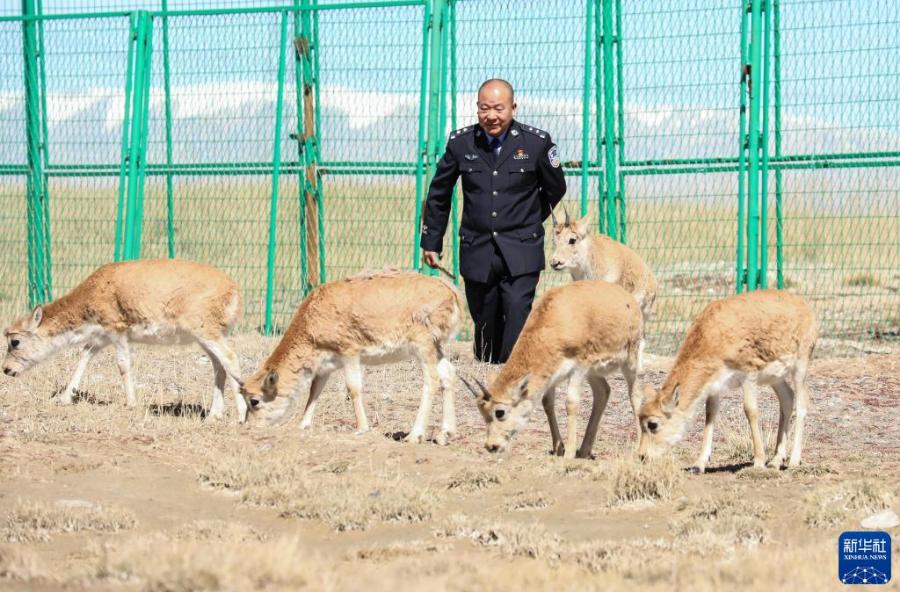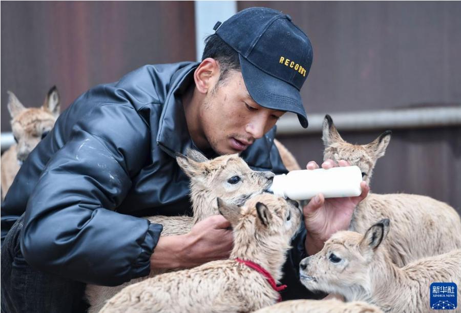 可可西里國家級自然保護(hù)區(qū)卓乃湖保護(hù)站的工作人員才文多杰在給藏羚羊幼仔喂奶(2020年7月7日攝)。