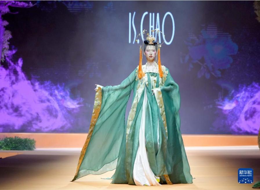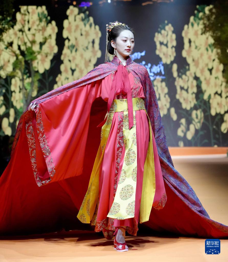 10月18日,模特在展示中國知名設計師、金頂獎獲得者張義超設計的時裝。