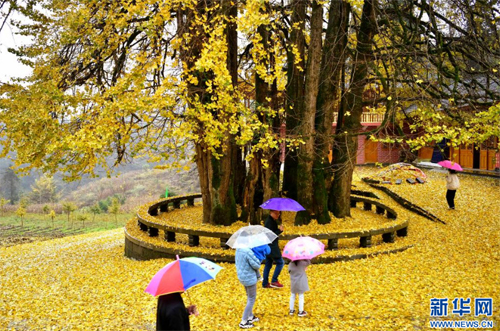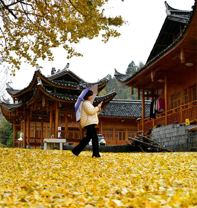 11月8日,游人在湖北省宣恩縣珠山鎮(zhèn)東門關(guān)村農(nóng)家院落前的古銀杏樹下游玩。