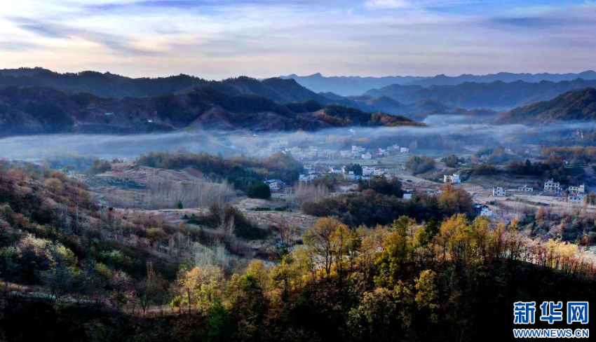 11月9日,朝霞映照著商南縣城(無人機照片)。