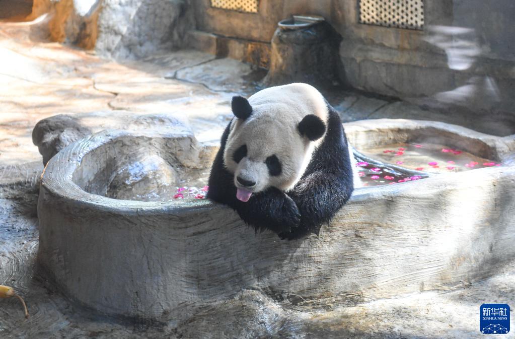 11月21日,在位于??诘暮D蠠釒б吧鷦又参飯@,大熊貓“舜舜”享受“花瓣浴”。
