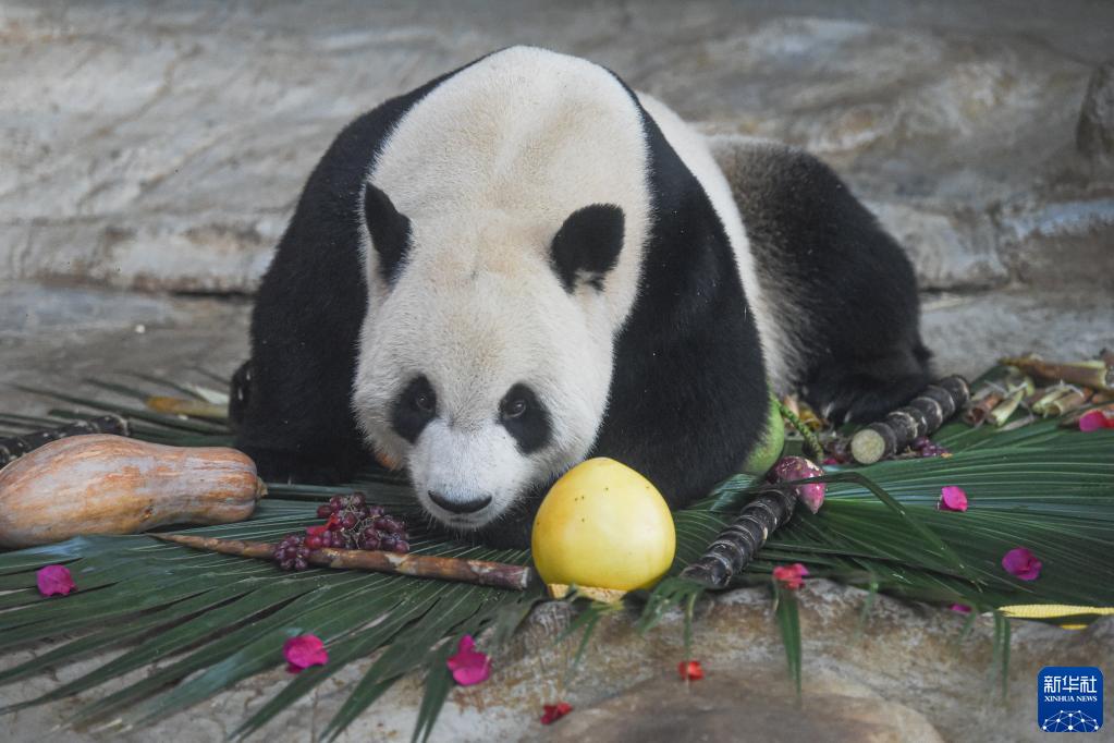11月21日,在位于??诘暮D蠠釒б吧鷦又参飯@,大熊貓“舜舜”享用美食。