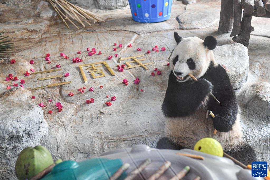 當日,為慶祝大熊貓“貢貢”和“舜舜”來到海南三周年,位于??诘暮D蠠釒б吧鷦又参飯@為這對熊貓兄弟準備了新玩具和竹筍、水果、胡蘿卜等美食,并組織“熊貓粉”對大熊貓進行網(wǎng)絡視頻直播。