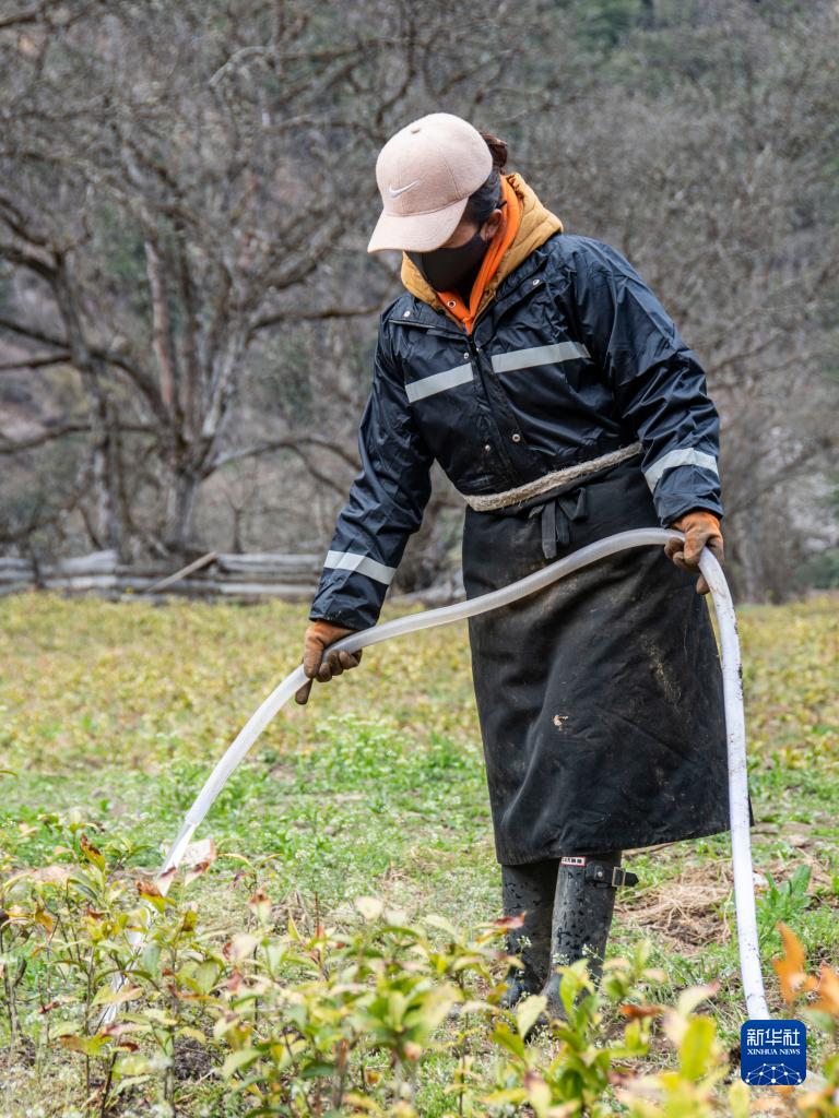 西藏林芝市波密縣古鄉(xiāng)雪瓦卡村村民索朗措姆在家門口的茶園工作(3月31日攝)。