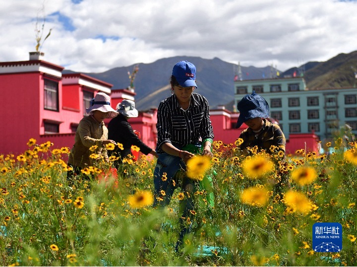 西藏拉薩市四季吉祥村村民在采摘雪菊(2017年9月27日攝)。