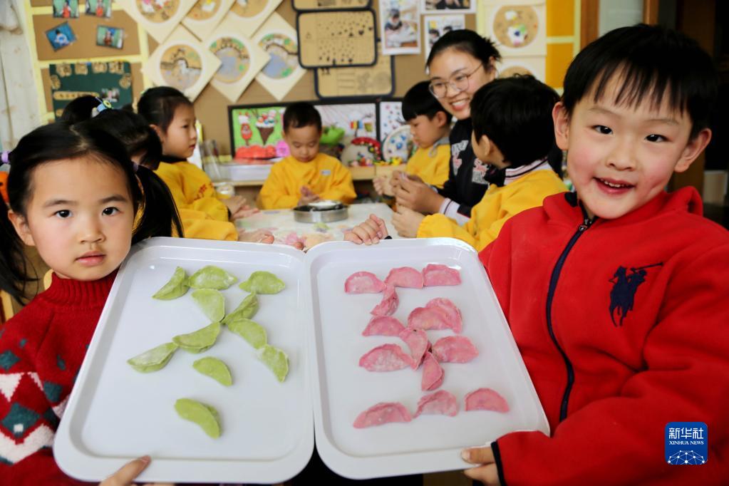 12月20日,山東省煙臺(tái)市福山區(qū)實(shí)驗(yàn)幼兒園的小朋友學(xué)包餃子。