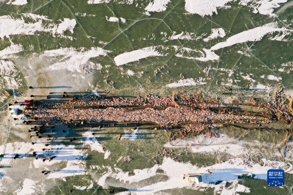 12月26日,漁民趕馬拉動絞盤,使?jié)O網(wǎng)在冰面下按照既定位置放置(無人機照片)。