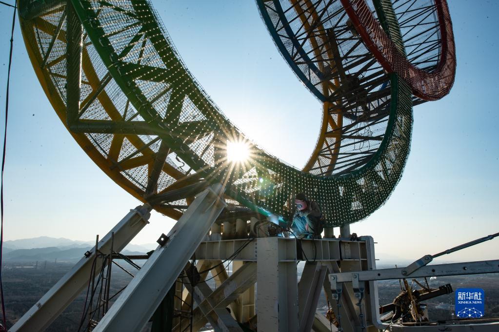 近日,位于北京冬奧會(huì)延慶賽區(qū)的“海陀塔”上的奧運(yùn)五環(huán)結(jié)構(gòu)吊裝作業(yè)完成,進(jìn)入工程收尾階段。塔頂設(shè)置奧運(yùn)五環(huán)標(biāo)志,表面安裝了共計(jì)7萬余個(gè)白色點(diǎn)光源,塔身加裝飄帶形裝飾。