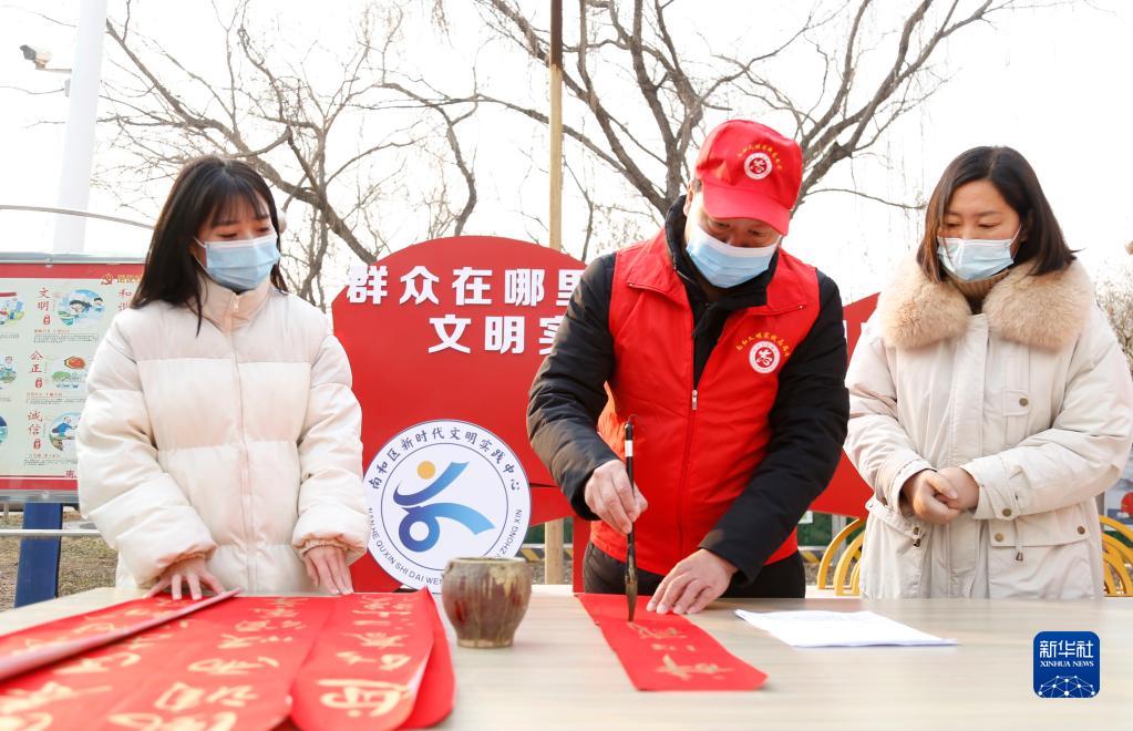 1月19日,在河北省邢臺市南和區(qū)新時代文明實踐中心,黨員志愿者為居民書寫春聯(lián)。