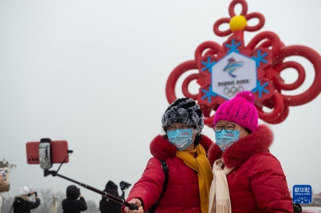 1月20日,游客在北京天安門廣場“精彩冬奧”主題花壇前拍照留念。新華社記者 陳鐘昊 攝