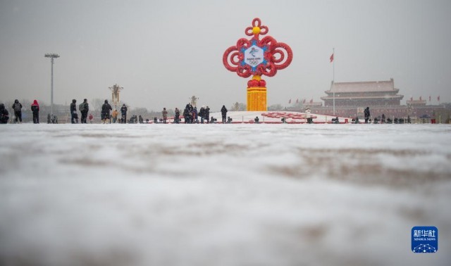 1月20日拍攝的北京天安門廣場“精彩冬奧”主題花壇。當(dāng)日是大寒節(jié)氣,北京迎來降雪。新華社記者 陳鐘昊 攝