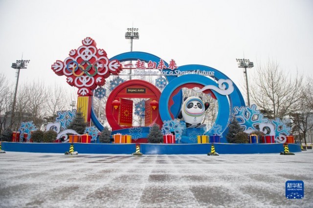 這是1月20日拍攝的北京奧林匹克公園內(nèi)的一處冬奧主題景觀。新華社記者 陳鐘昊 攝
