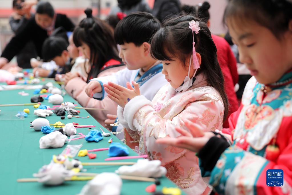 2月14日,在安徽省淮北市第三實驗小學(xué),學(xué)生們在學(xué)習(xí)捏面塑。