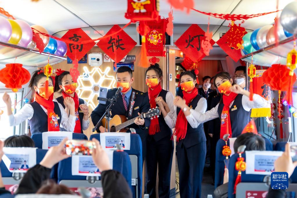 2月14日,在G8039次列車上,中國鐵路沈陽局集團有限公司沈陽客運段職工為旅客表演節(jié)目。