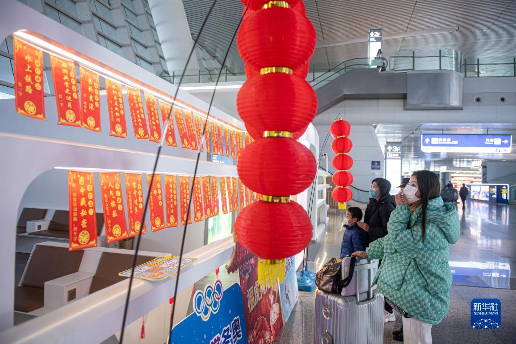 2月14日,旅客們在杭州東站候車室內(nèi)猜燈謎。