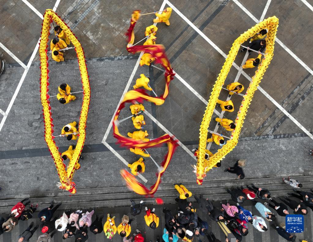 2月14日,在湖南省衡陽市蒸湘區(qū)蒸湘街道,人們在觀看舞龍表演(無人機照片)。