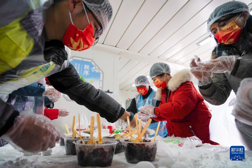 2月14日,在中建三局三公司南京華茂中心項目工人生活區(qū),工人們和南京市鼓樓區(qū)工人新村社區(qū)的居民一起制作湯圓。