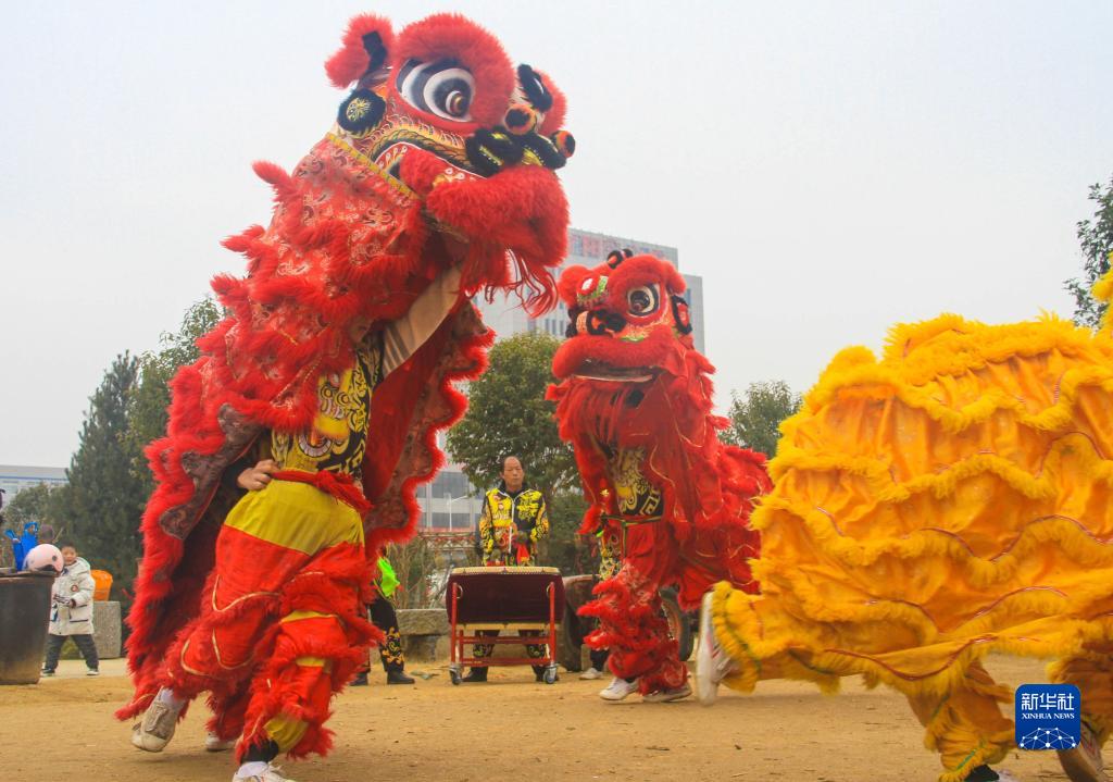 2月14日,民間藝人在河南省南陽市高新區(qū)百里奚街道內(nèi)表演舞獅。