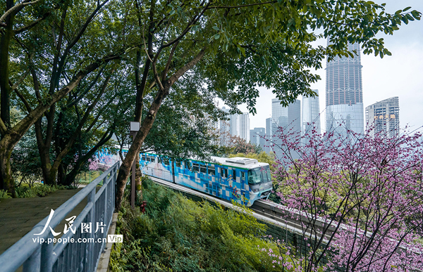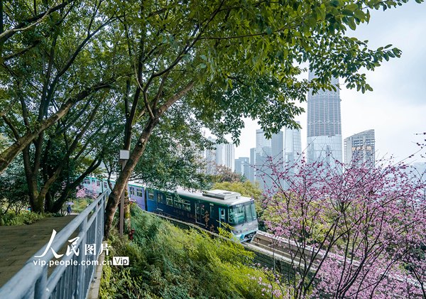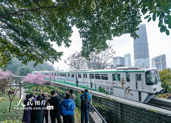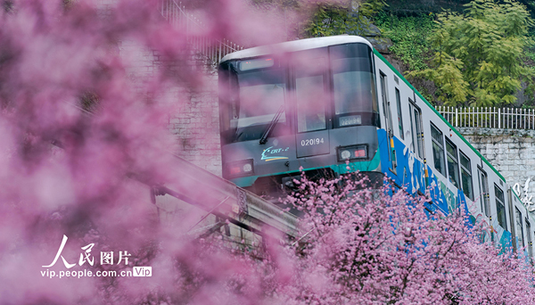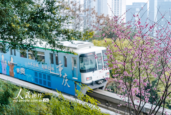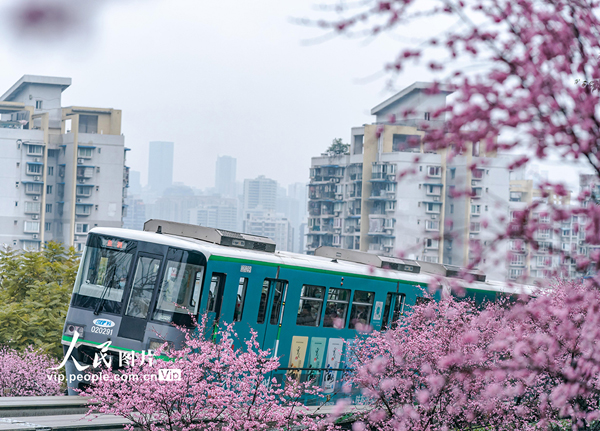 2022年2月20日,重慶市軌道交通二號線佛圖關段的美人梅迎春綻放,列車穿行花海,猶如開往春天的列車。李洪波攝(人民圖片網(wǎng))