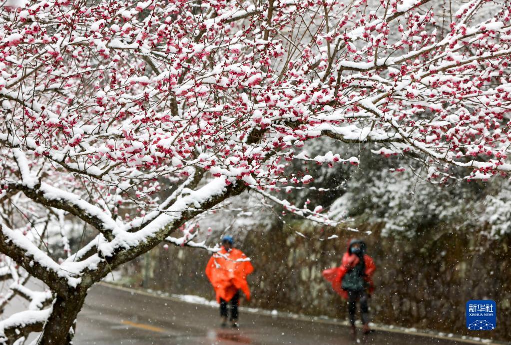 2月22日,游人在湖南張家界景區(qū)黃石寨梅園踏雪賞梅。