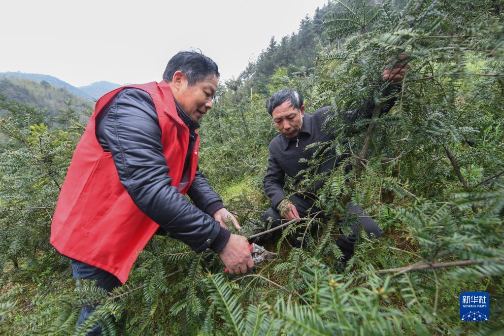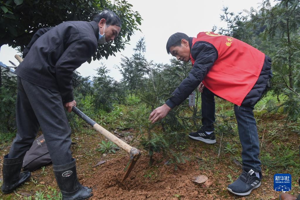 3月23日,在杭州市臨安區(qū)板橋鎮(zhèn)花橋村,香榧種植戶在農(nóng)技專家(右)指導(dǎo)下移栽香榧苗。香榧種植是板橋鎮(zhèn)百姓的重要收入來(lái)源,種植面積8000多畝。