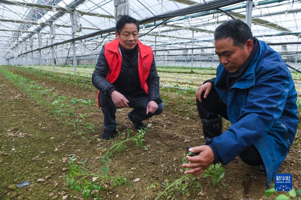 3月23日,“田間課堂”小分隊(duì)的農(nóng)技專家(左)在板橋鎮(zhèn)錦興農(nóng)業(yè)蔬菜基地走訪指導(dǎo)。