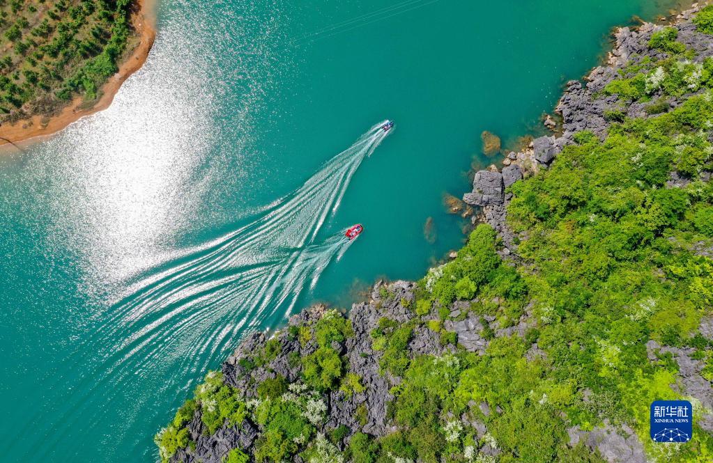 4月21日,在湖南省永州市道縣壽雁鎮(zhèn)樂海水庫,護水志愿者乘坐快艇進行水上巡查作業(yè)(無人機照片)。