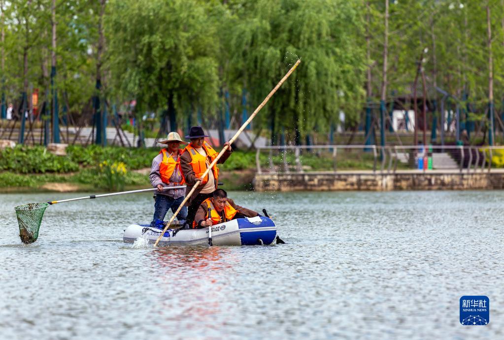 4月21日,在山東省青州市堯王湖,工作人員清理水草和垃圾(無人機照片)。