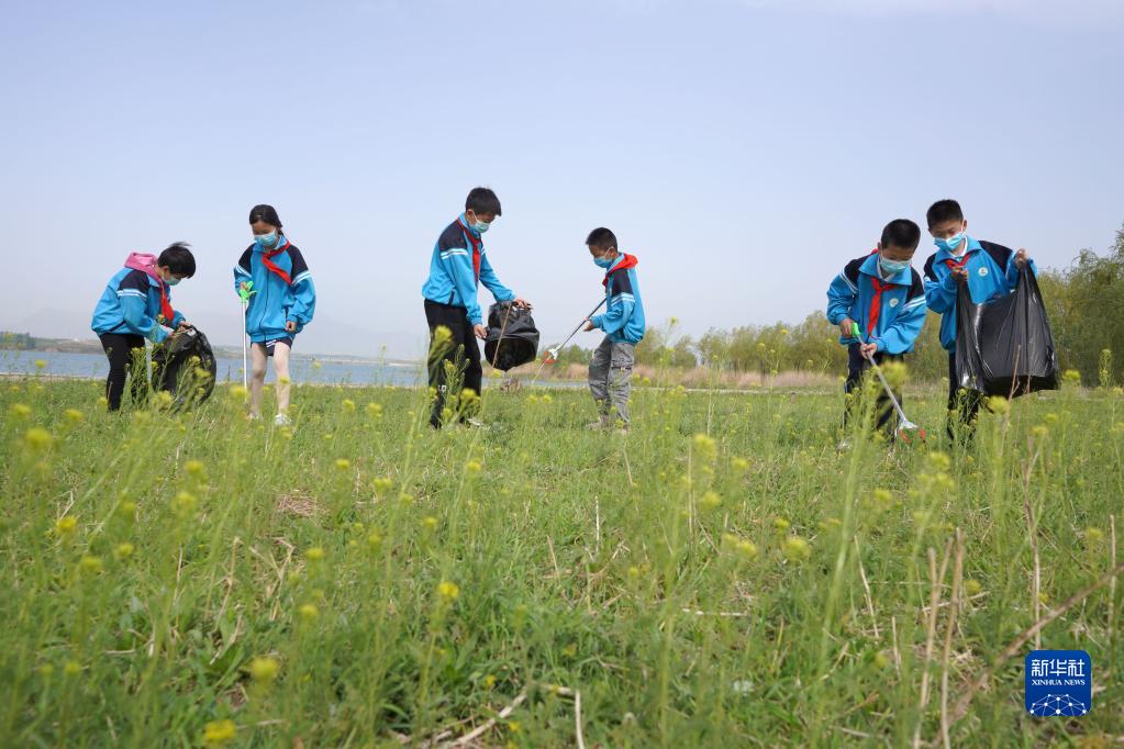 4月21日,河北省邢臺市內(nèi)丘縣柳林鎮(zhèn)中心小學學生在鵲山湖畔撿拾垃圾。