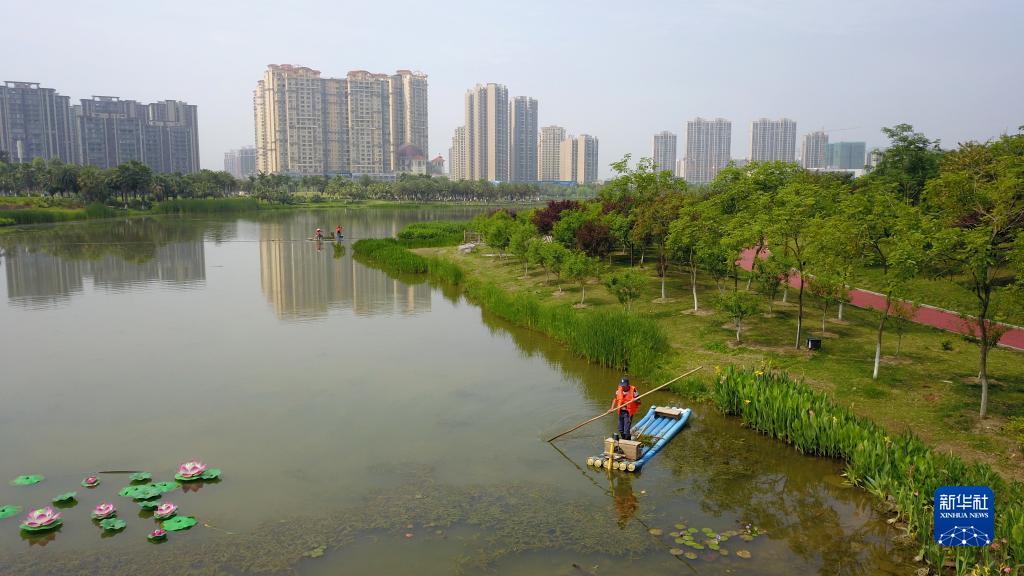 4月21日,環(huán)衛(wèi)工人在廣西賀州市愛蓮湖公園劃乘小船清理湖面漂浮物(無人機照片)。