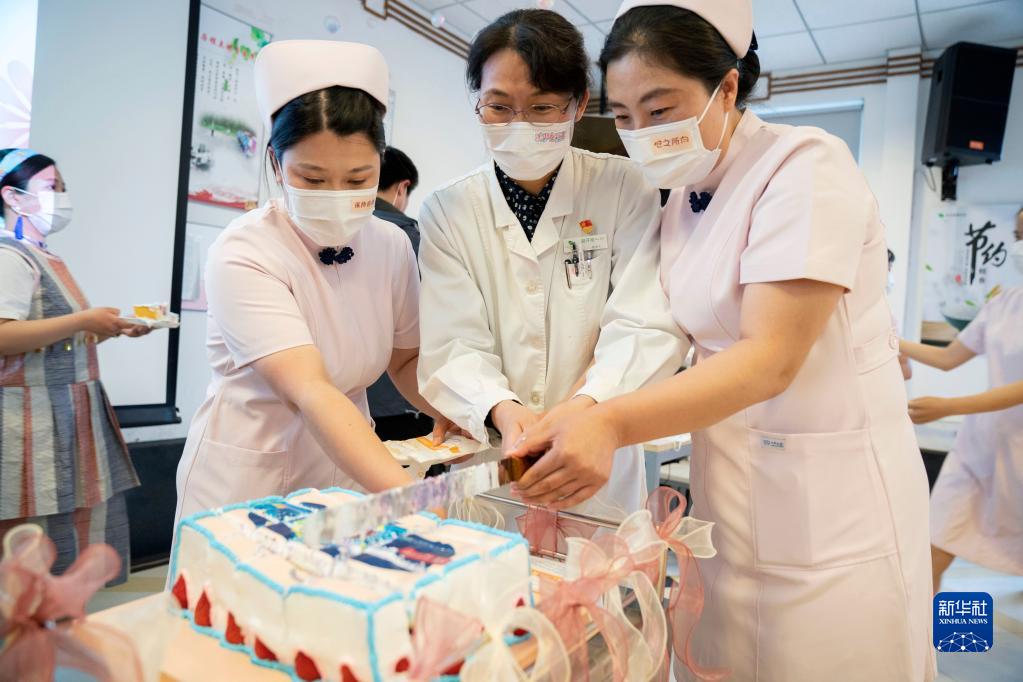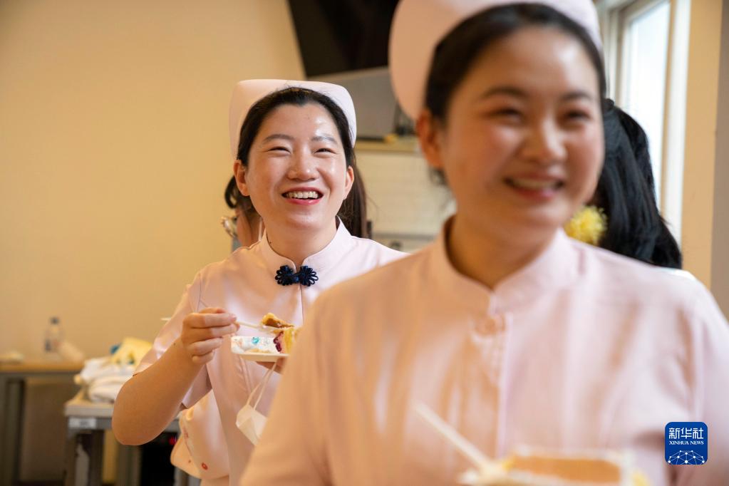 5月11日,在北京按摩醫(yī)院舉行的國際護士節(jié)慶祝活動上,醫(yī)護人員吃蛋糕。